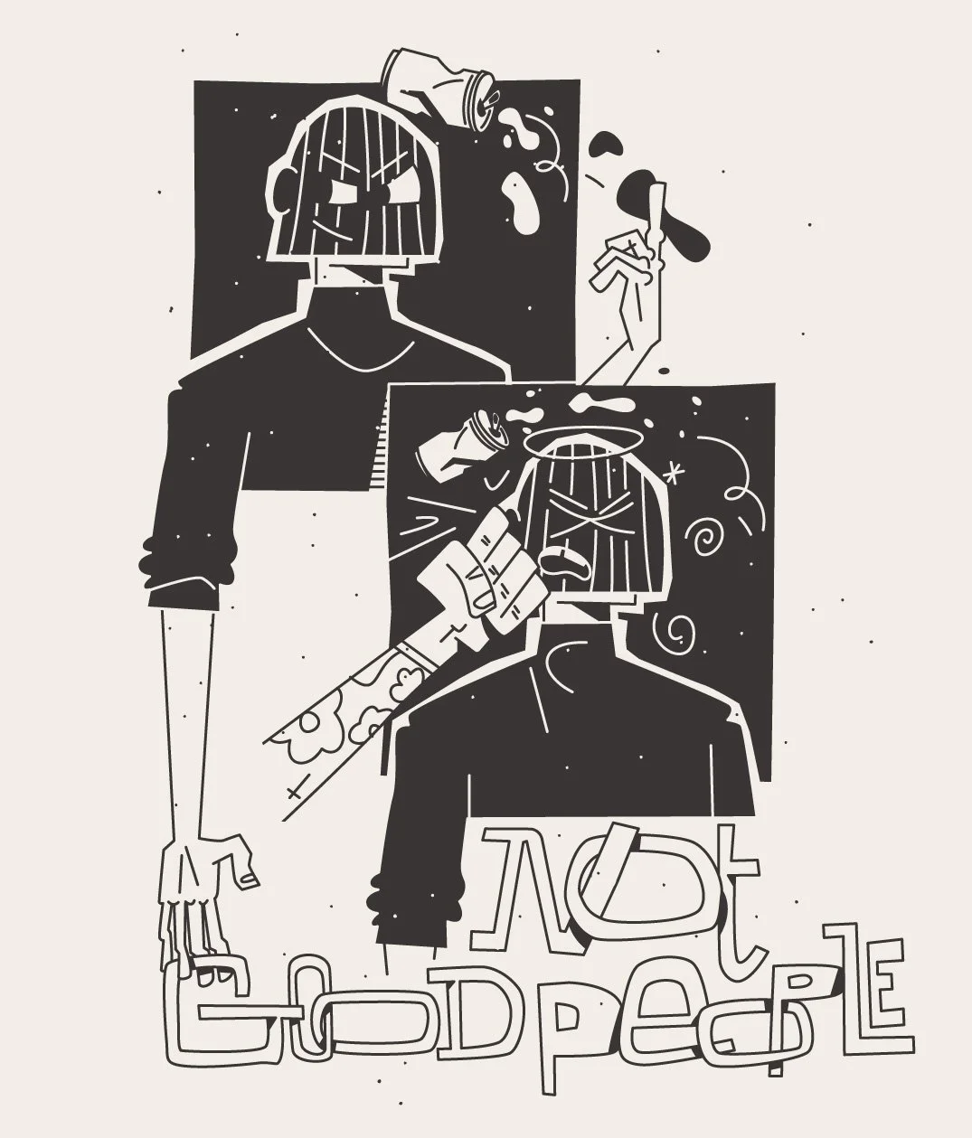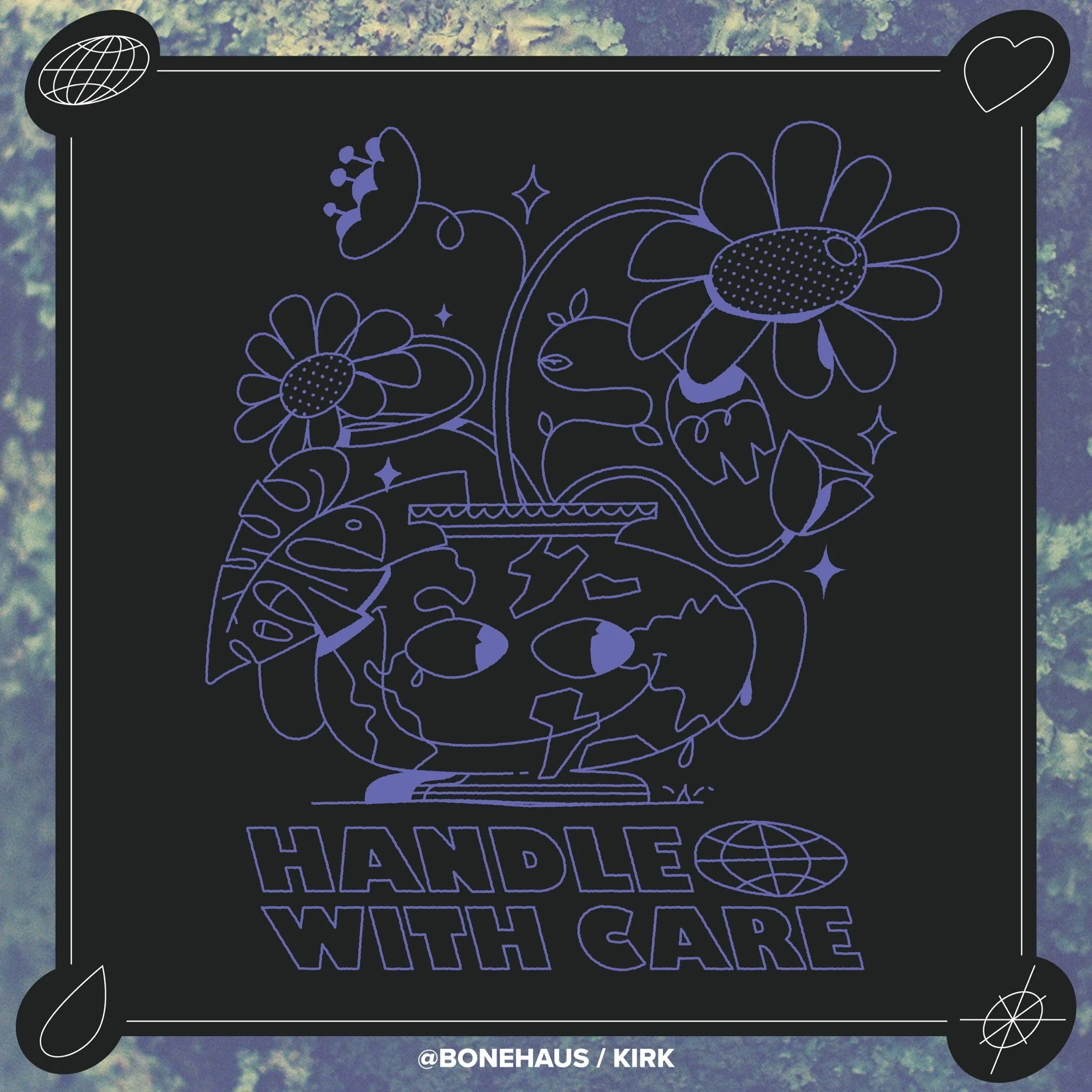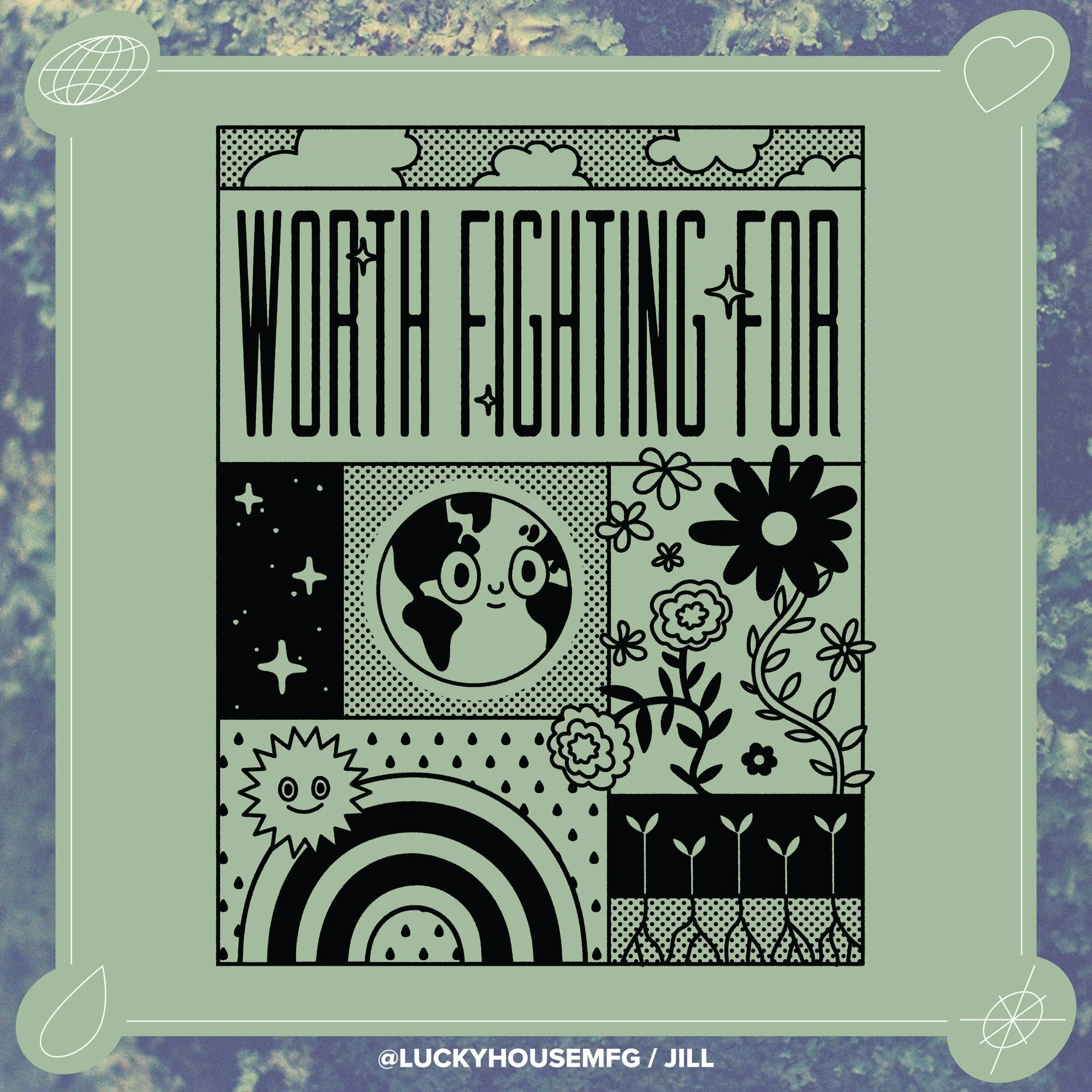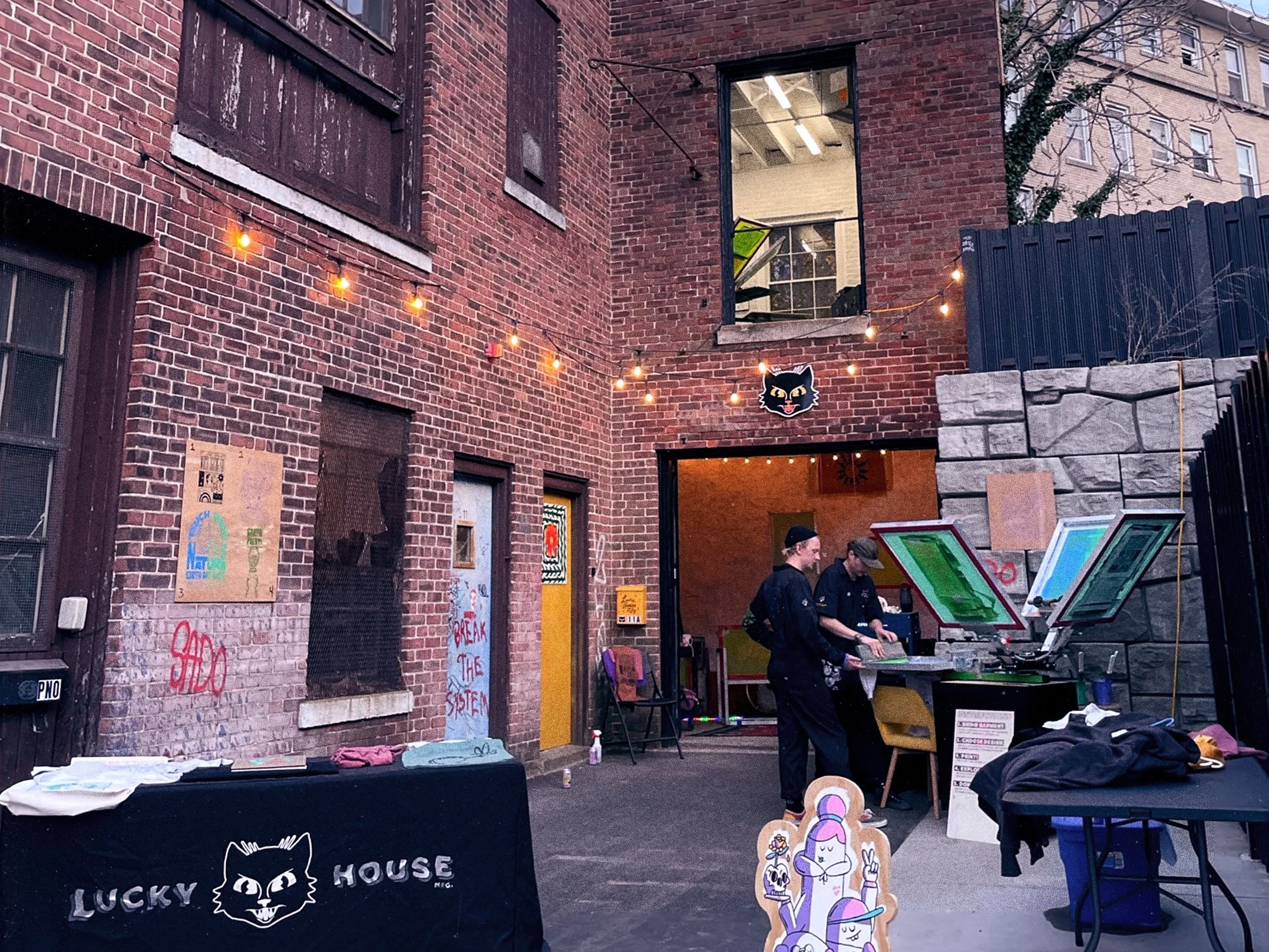 All pieces screen printed by Lucky House MFG with eco-conscious inks on upcycled garments brought by supporters and patrons.