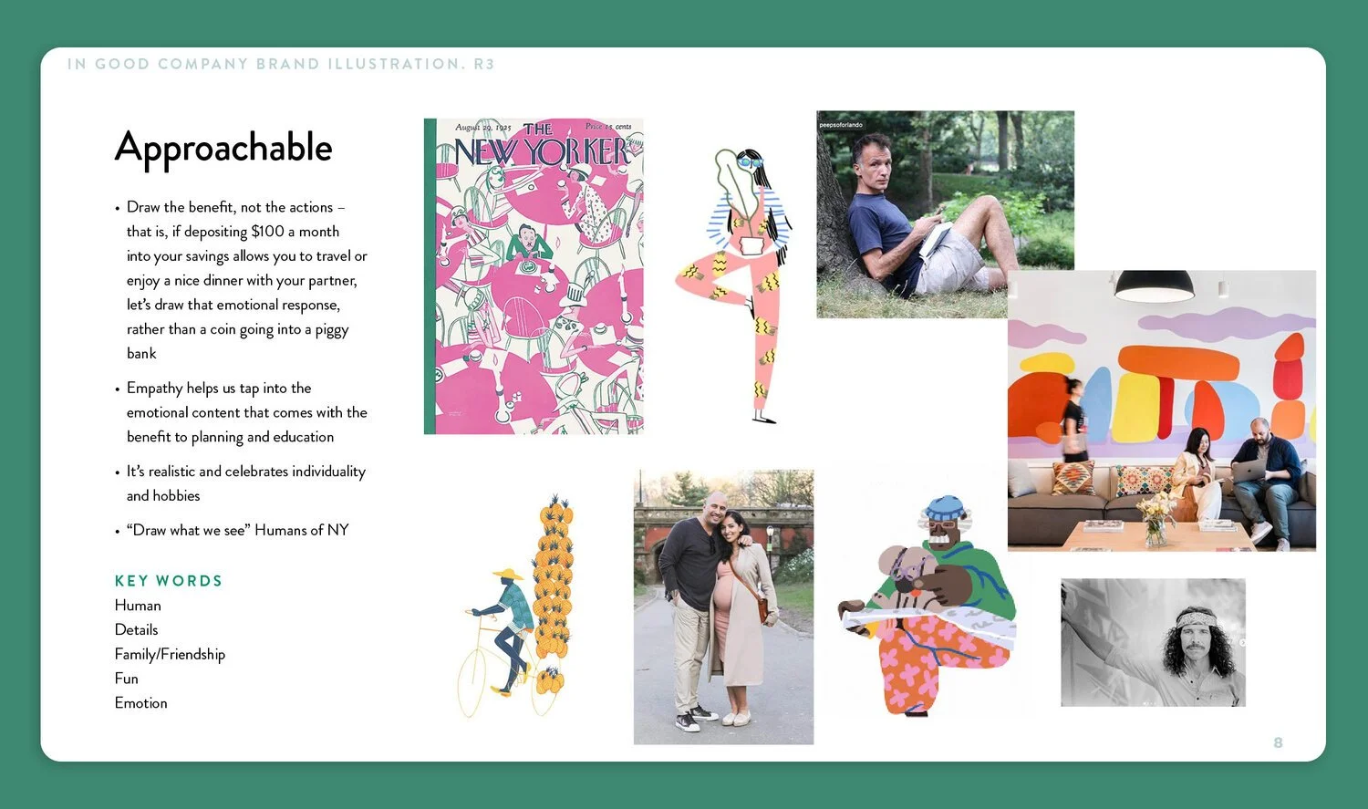We built the illustration style off the branding that In Good Company (IGC) had established over the years. As they’ve evolved and found their footing, it’s become more and more apparent what their illustration would look like. Here are some snippets from the deck.